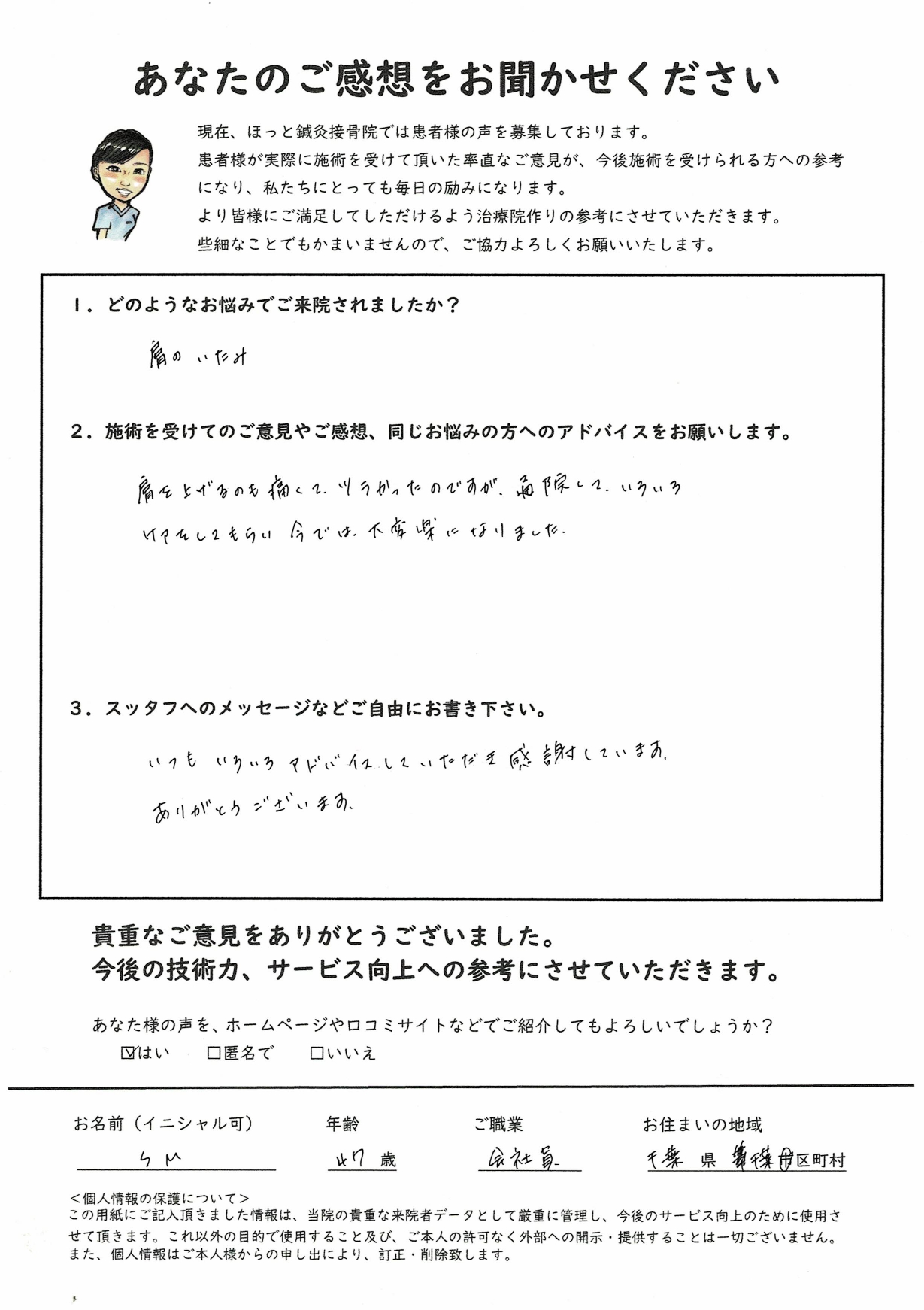 肩を上げるのも痛くて辛かったのですが、通院していろいろケアをしてもらい、今では大変楽になりました。